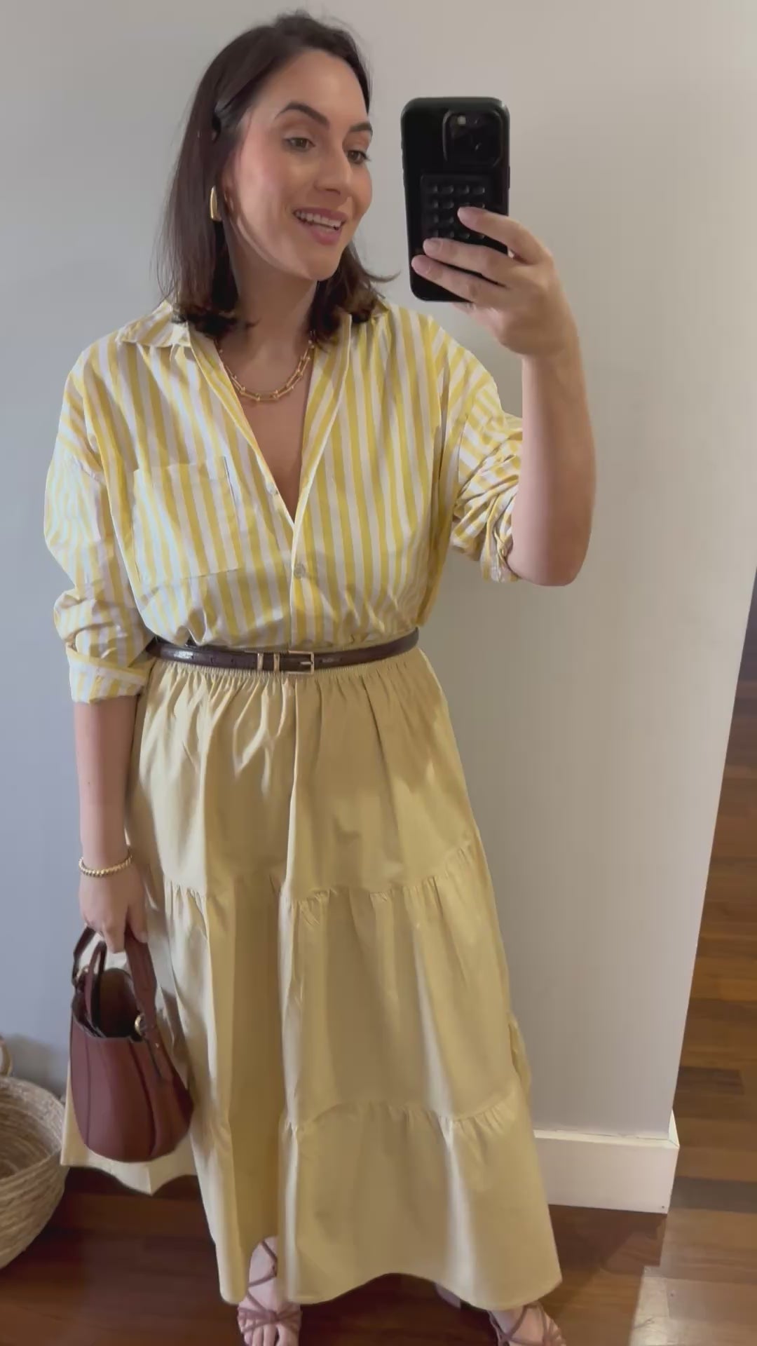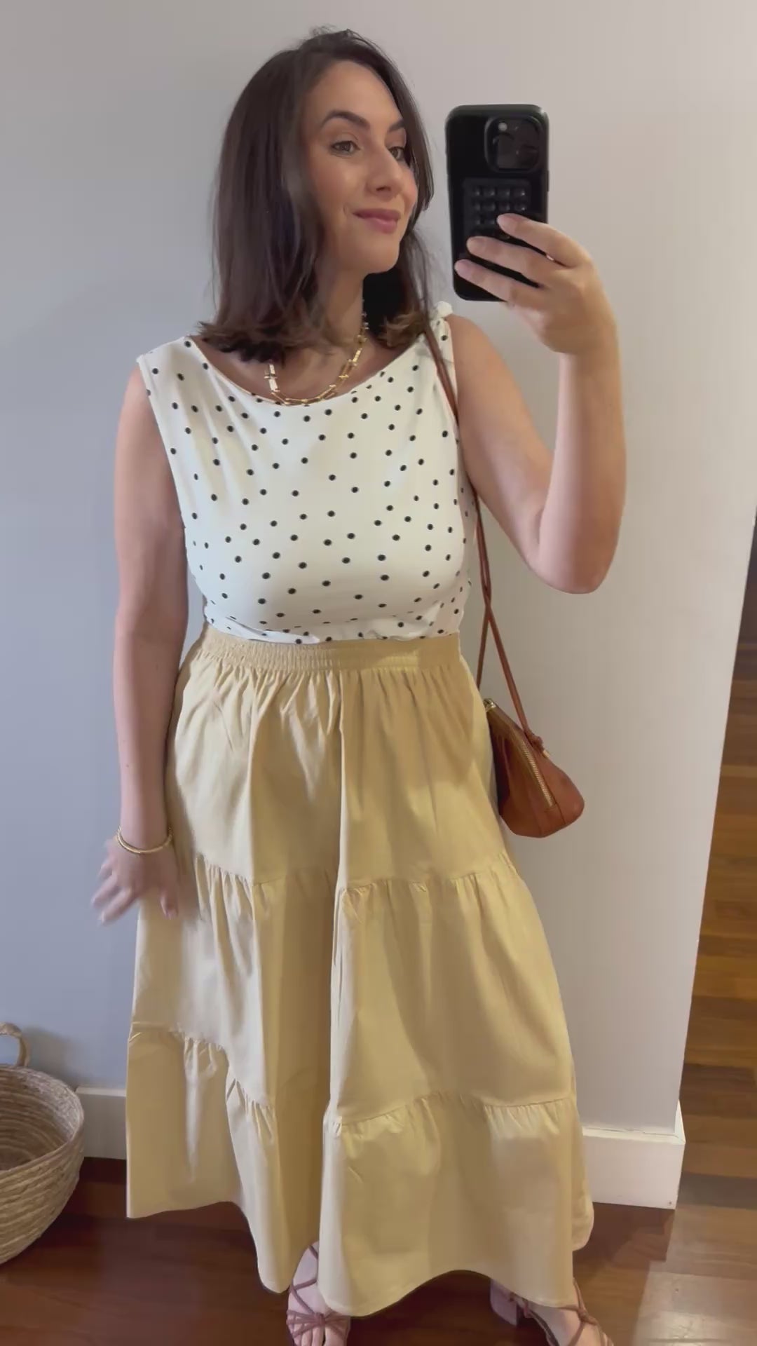 Seu elástico franzido na cintura garante ajuste ideal e conforto ao vestir, enquanto o recorte com leve babado na barra adiciona fluidez e um toque feminino irresistível. Versátil e atemporal, é a escolha certa para compor desde produções casuais até looks mais sofisticados — basta variar os acessórios.