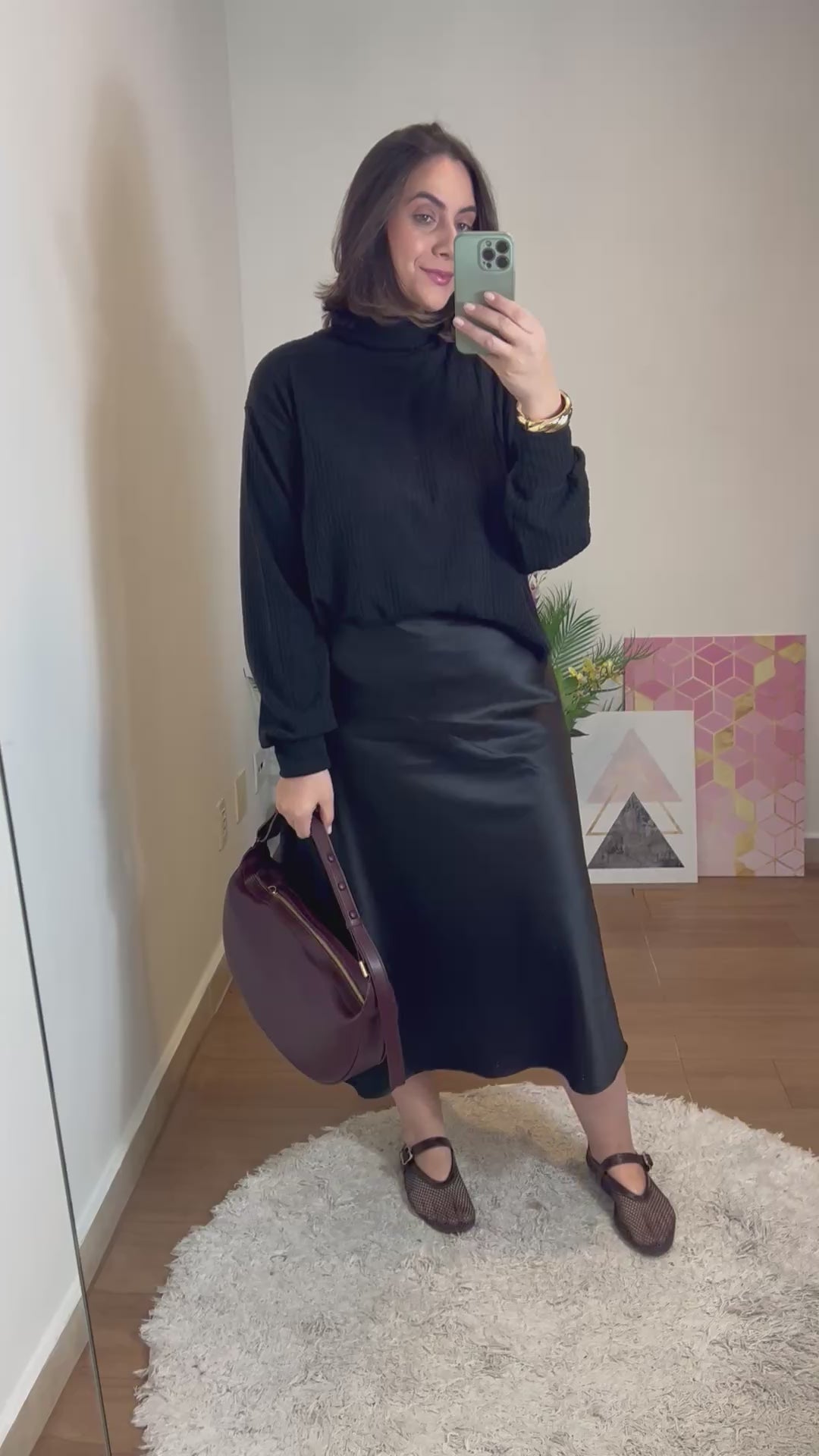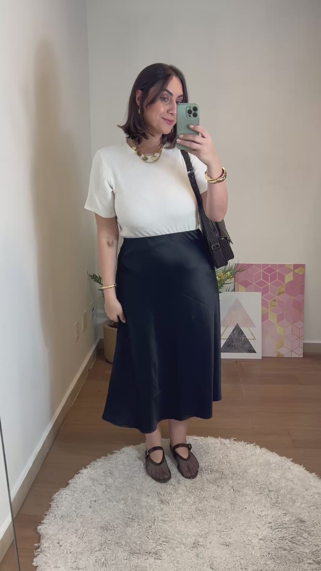 Saia midi em cetim com caimento impecável e modelagem pensada para nosso corpo com curvas