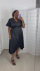 Modelo transpassado midi com decote em V, mangas soltas e amarração em laço na cintura.