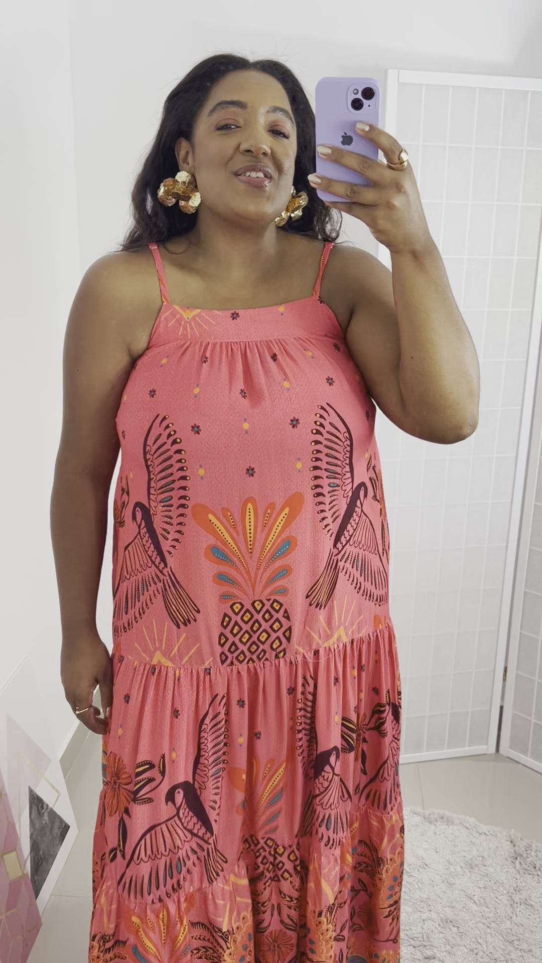 Vestido longo em viscose com estampa de pássaros em fundo rosa.